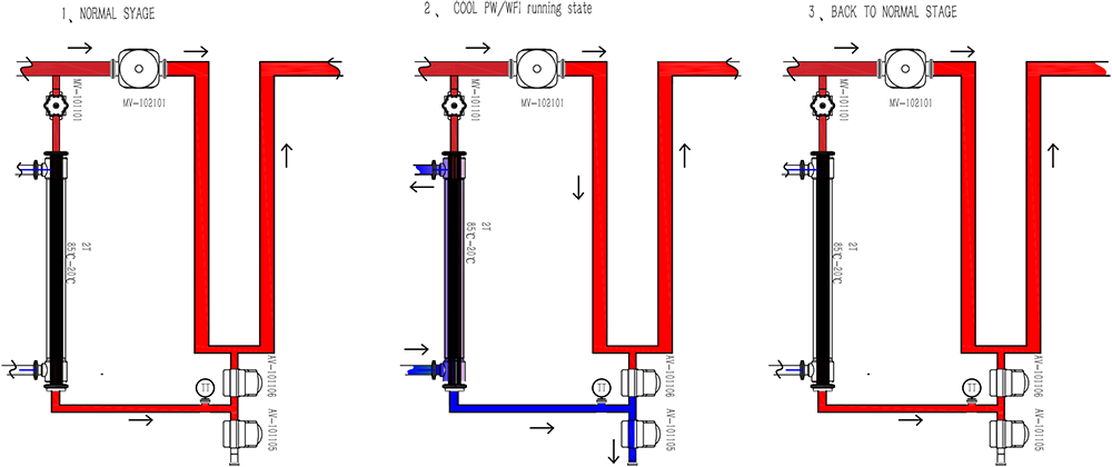 Cloí le rialacháin dhian FDA, USP ASME BPE, agus GMP sa tionscal cógaisíochta. Nuair nach bhfuil an córas ag obair, is féidir an t-uisce te sa phríomhchúrsaíocht a dhíghalrú go leanúnach chun an chuid is mó de na coinníollacha oibre a chomhlíonadh agus tá roghanna próisis iomadúla ar fáil.